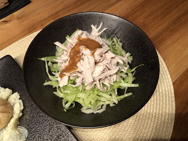 鶏ムネ肉に塩をすり込み、生姜を入れたお湯で数分茹でて火を止め、蓋をして放置(笑)