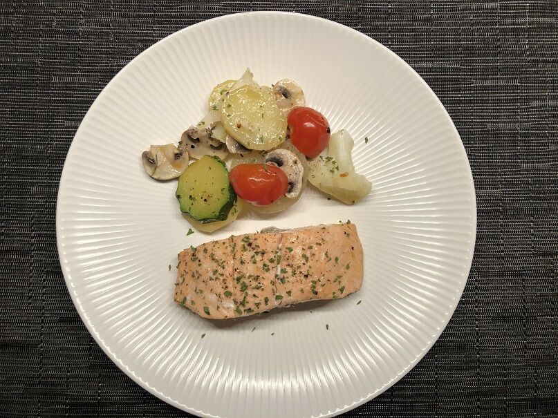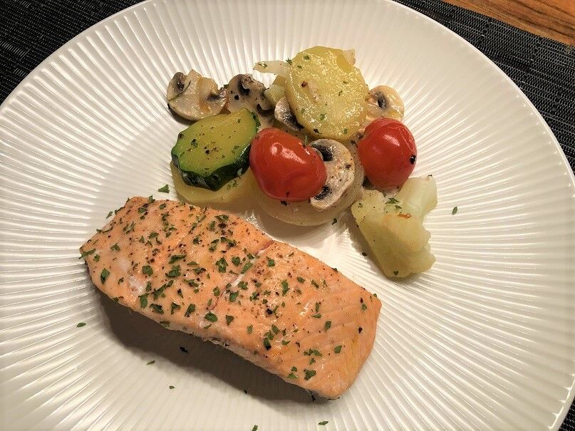 塩・胡椒したサーモンを乗せて、白ワインを注いで蒸し焼きに。