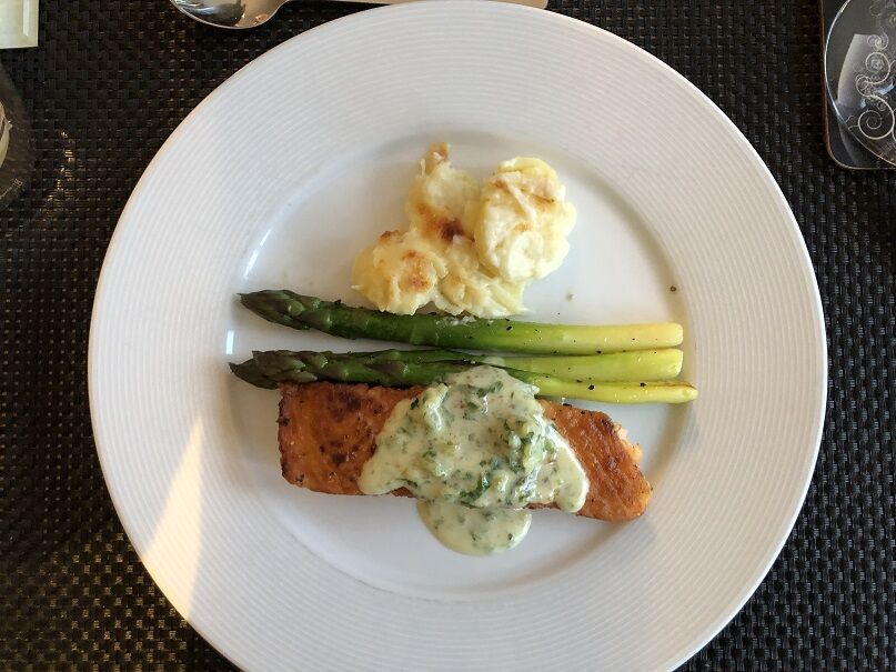 茹でてからソテーしたグリーンアスパラガス、じゃがいものグラタンと一緒に。