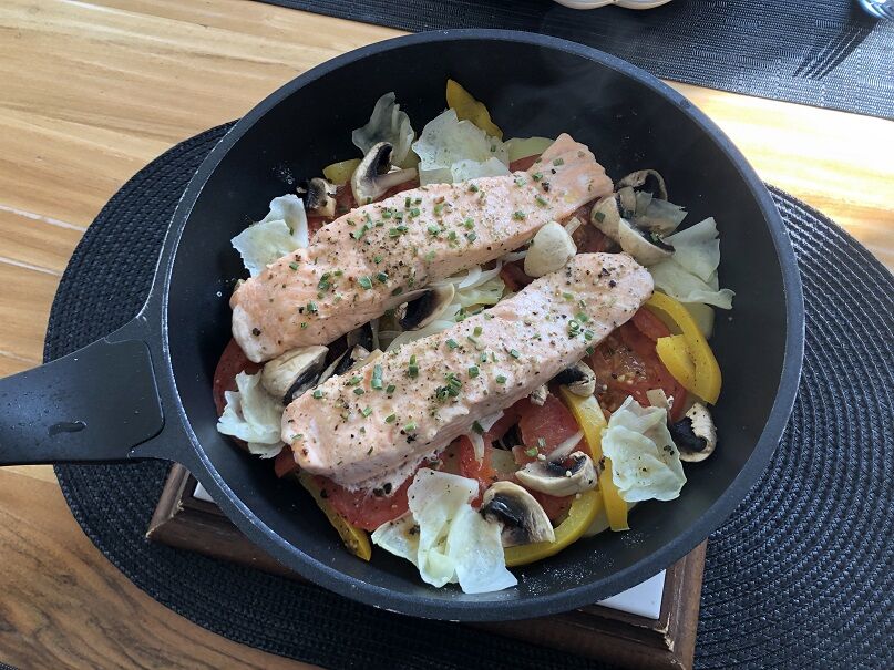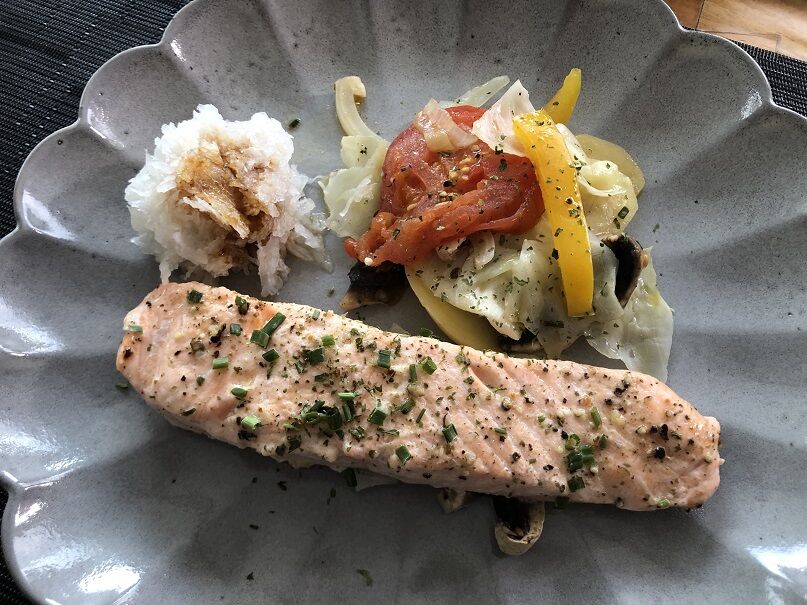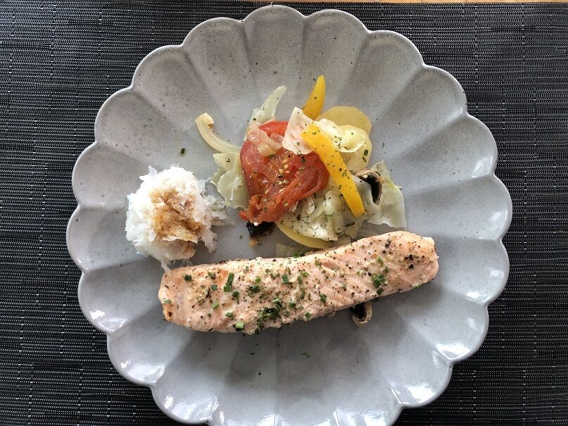 塩・胡椒したサーモンを乗せて、ハーブソルトをかけて、白ワインを入れて蒸します。