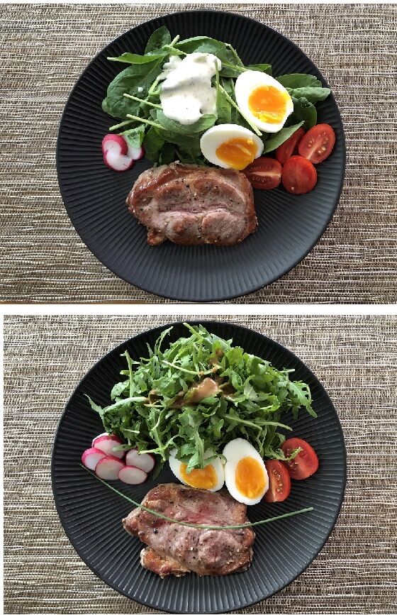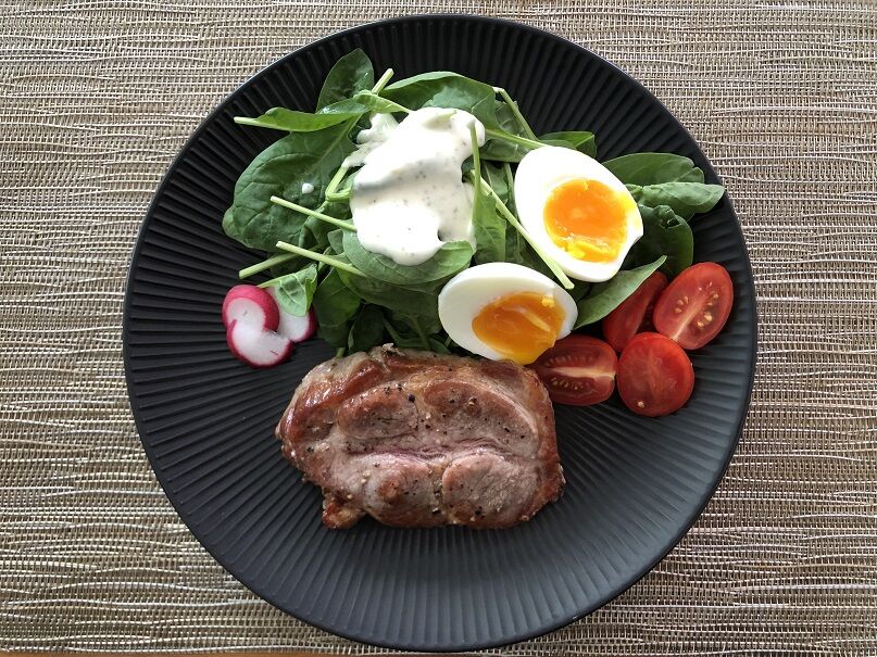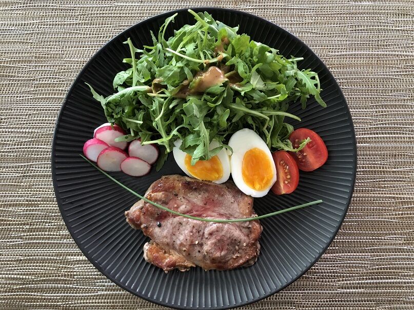 私の分は、ルッコラ+ごまドレッシング、茹で卵、ミニトマト、