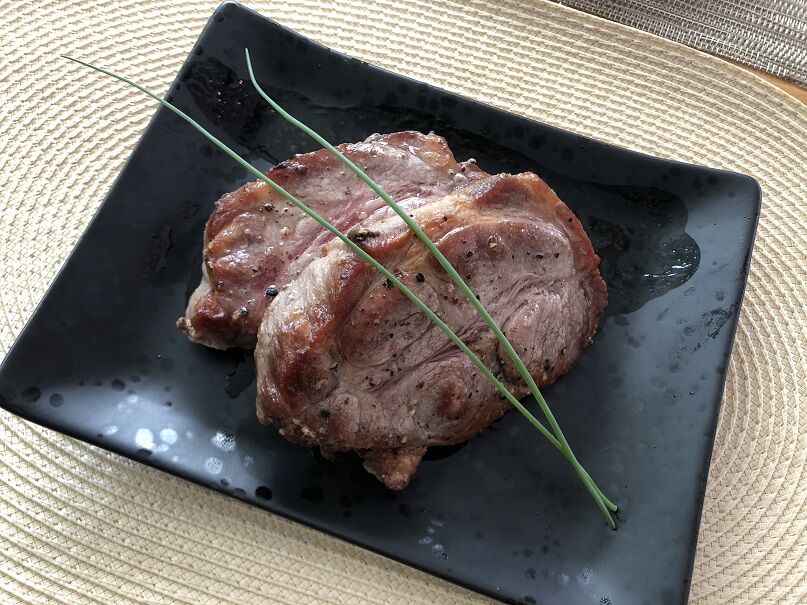 豚肩ロース肉のソテー、それぞれ青菜と。