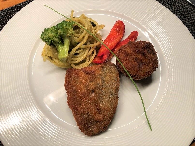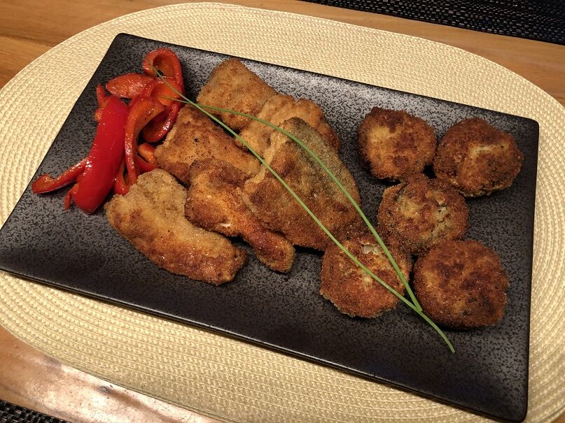 ニジマスのフライ、フィリングをしたマッシュルームのフライ。