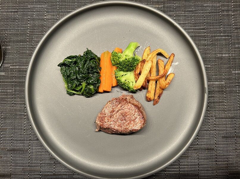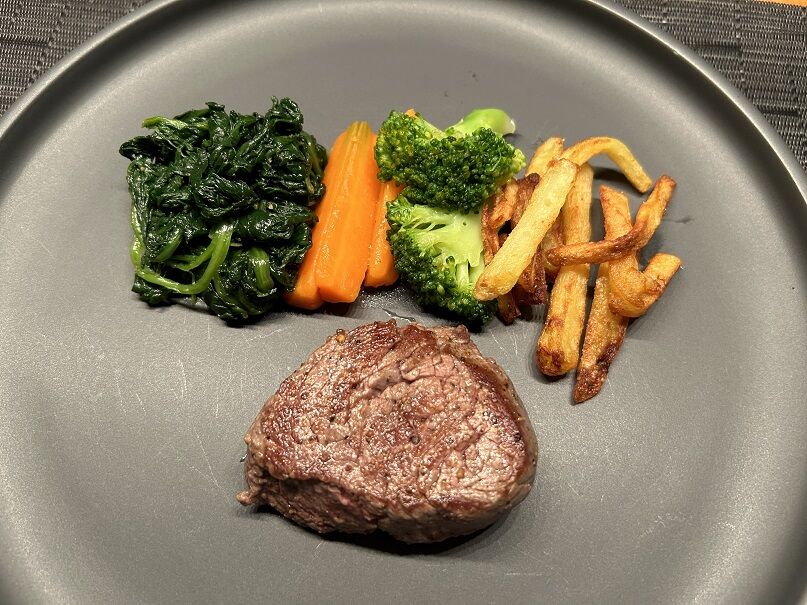 付け合わせは、フレンチフライ、ソテーしたほうれん草、茹でた人参+ブロッコリー。