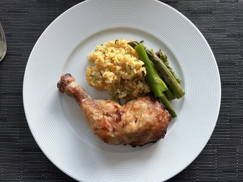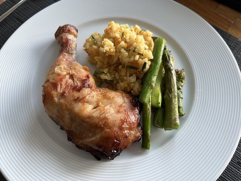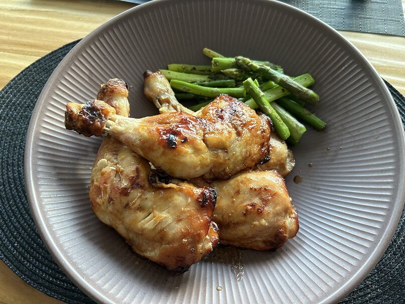 骨付き鶏モモ肉は、昨日からしょうゆ、アガヴェシロップ、日本酒に漬けておきました。