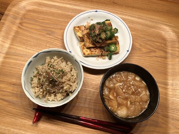 ごはんに味があるので、木綿豆腐にかけるおしょうゆはほんの少し。