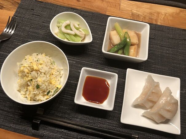蒸しエビ餃子は市販のもので、スチーマーで調理しました。