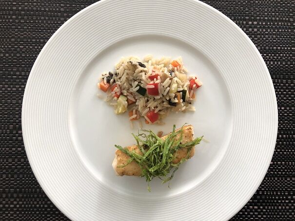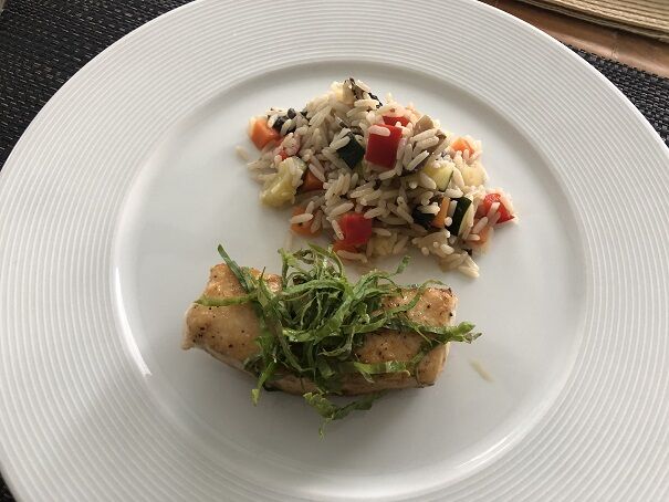 野菜をたっぷり入れた洋風炊き込みごはん(長粒種ライスで)を添えました。