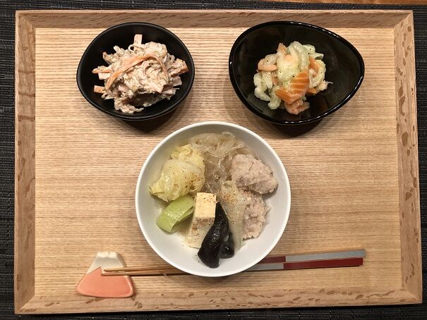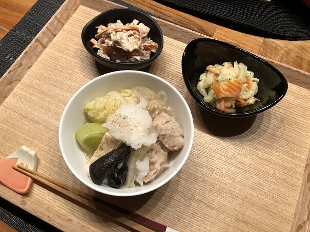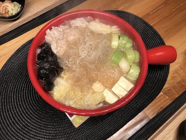 具は、鶏だんご、サボイキャベツ、木綿豆腐、春雨、ポロねぎ、白菜、キクラゲ。