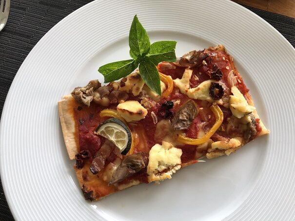 トッピングは、ベーコン、アーティチョークのオイル漬け、黄色のパプリカ、