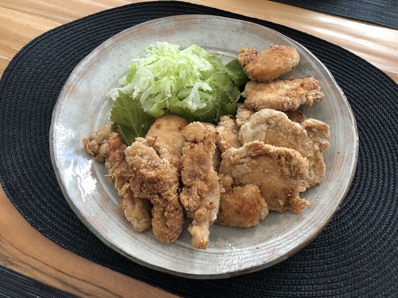 下味はしょうゆ、日本酒、ガーリックパウダー、すりおろした生姜。