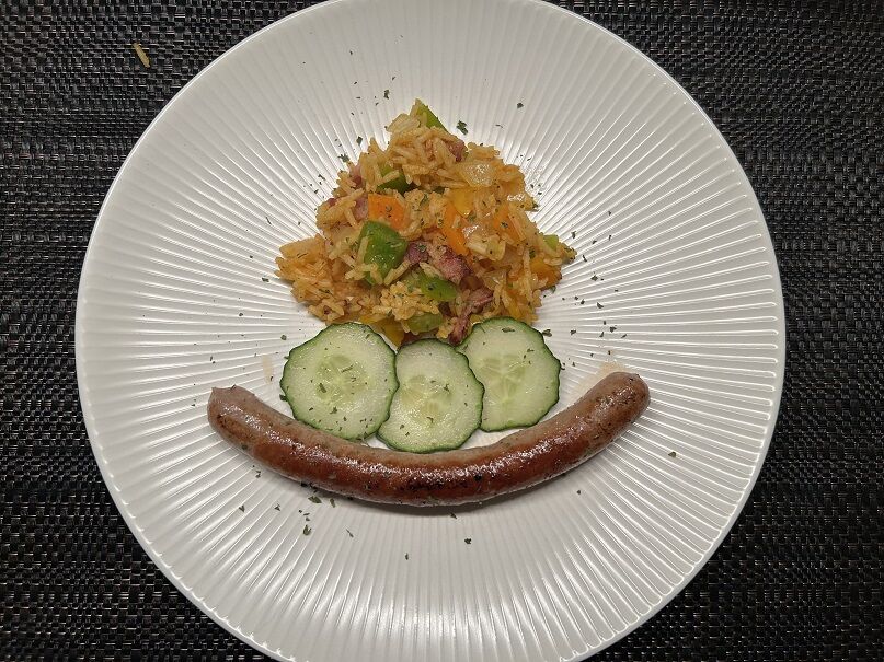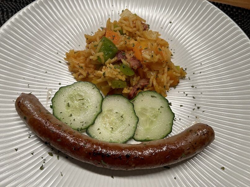 ジャンバラヤ風の洋風炊き込みごはんと一緒に頂きます。