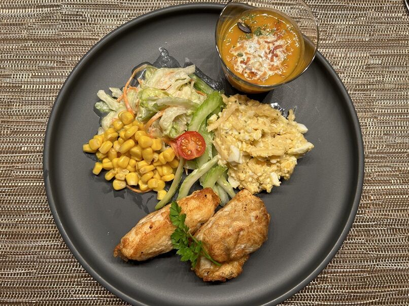 今日はレタス、セロリ、人参をヨーグルトソースで和えたコールスロー、セロリ、コーン、