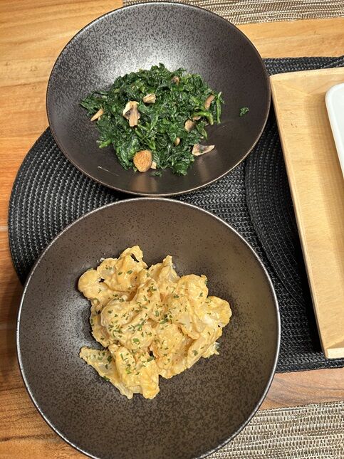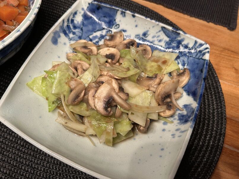 炒飯もどきには玉ねぎ、人参、マッシュルーム、炒り卵を。
