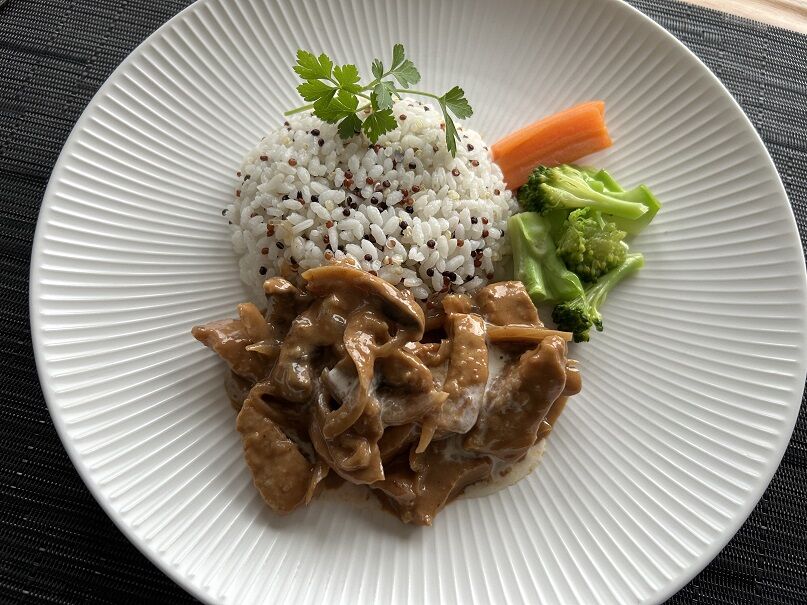 ごはん+キヌア、人参、ブロッコリーと一緒に頂きます。