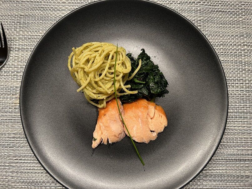 スパゲッティ・ペスト、ほうれん草のソテーと一緒に頂きます。