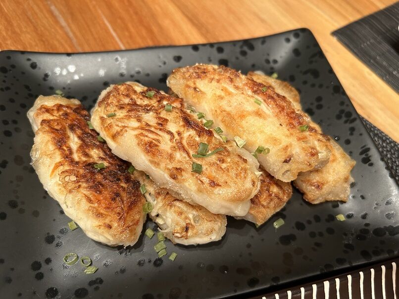 生春巻きに使うライスペーパーに具を包んで、多めの油で揚げ焼きに。