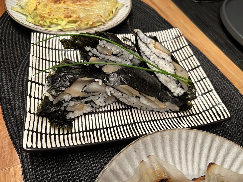 ごはんは酢飯にして、帆立貝柱の燻製と一緒に乗せて巻いて・・・出来上がり。