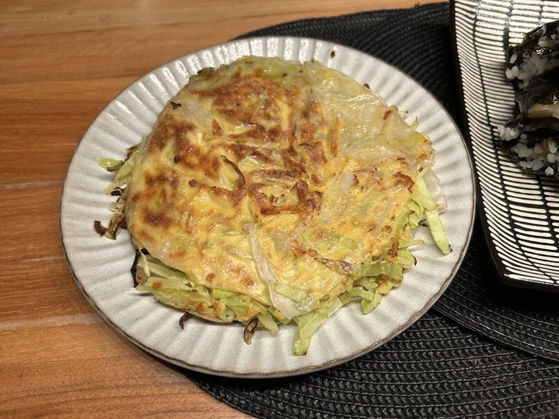 千切りにしたキャベツと乾燥えび、粉末だしを溶いた卵と混ぜたものを乗せ、