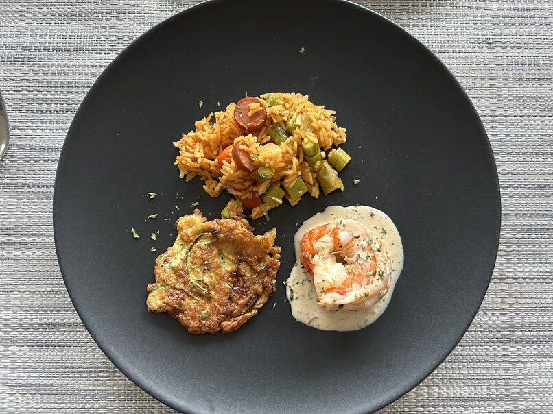 ジャンバラヤにはウィンナー、赤くなった緑のパプリカ、玉ねぎ、