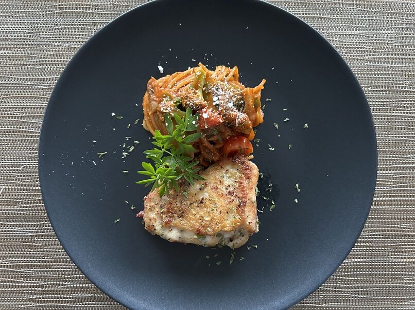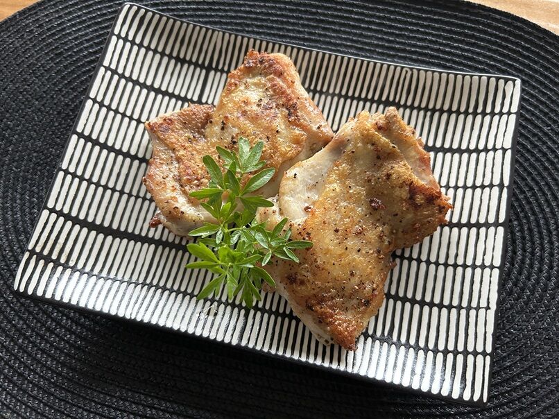 鶏モモ肉には塩・胡椒、そしてガーリックパウダーを振りソテー。