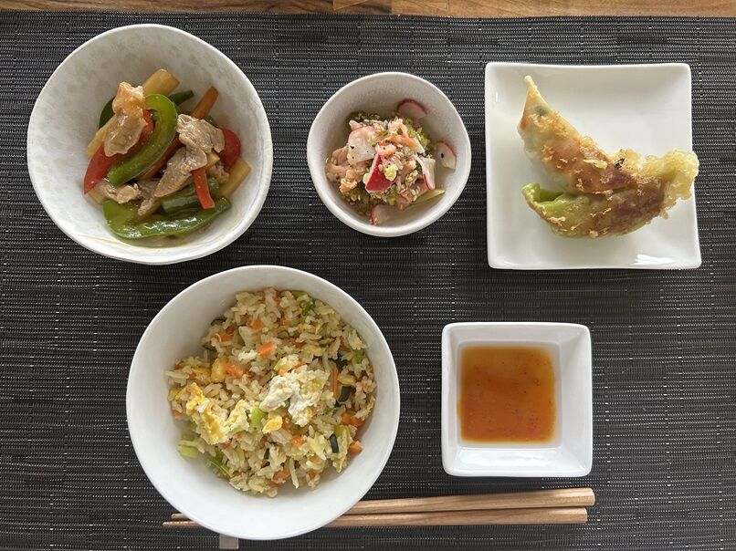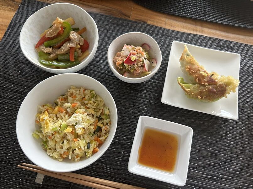 夕食は家にある材料で作った物と残り物の整理です。