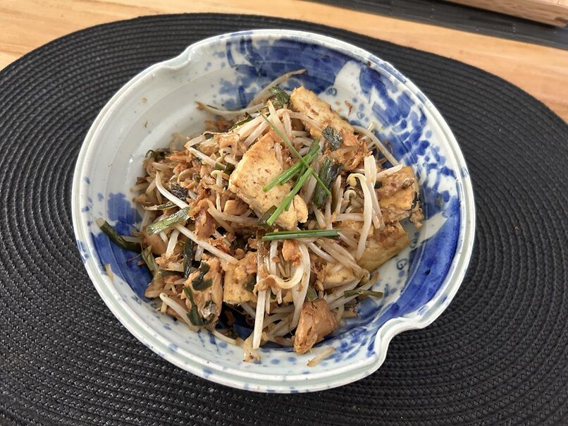 豆腐チャンプルーには、木綿豆腐の他、もやし、ツナ缶、乾燥ニラを入れました。