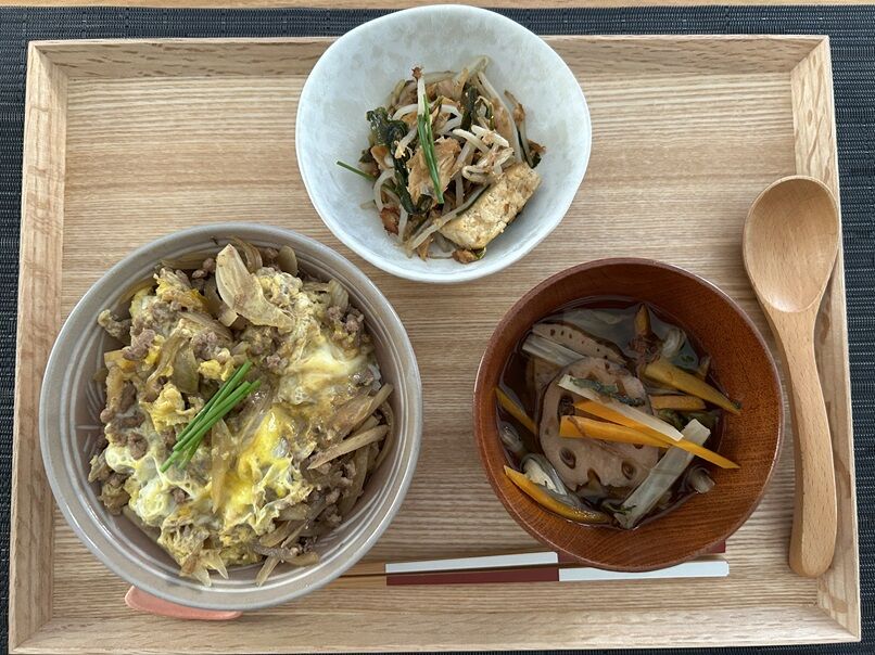 柳川風丼には牛ひき肉、たっぷりの玉ねぎ、乾燥ごぼうを。