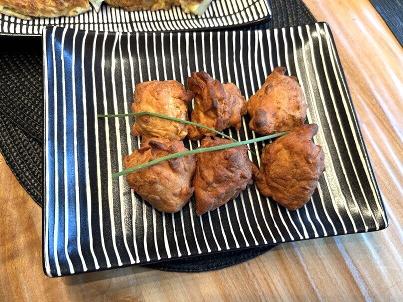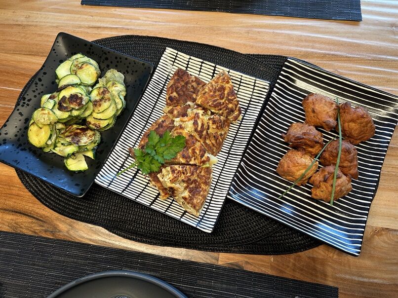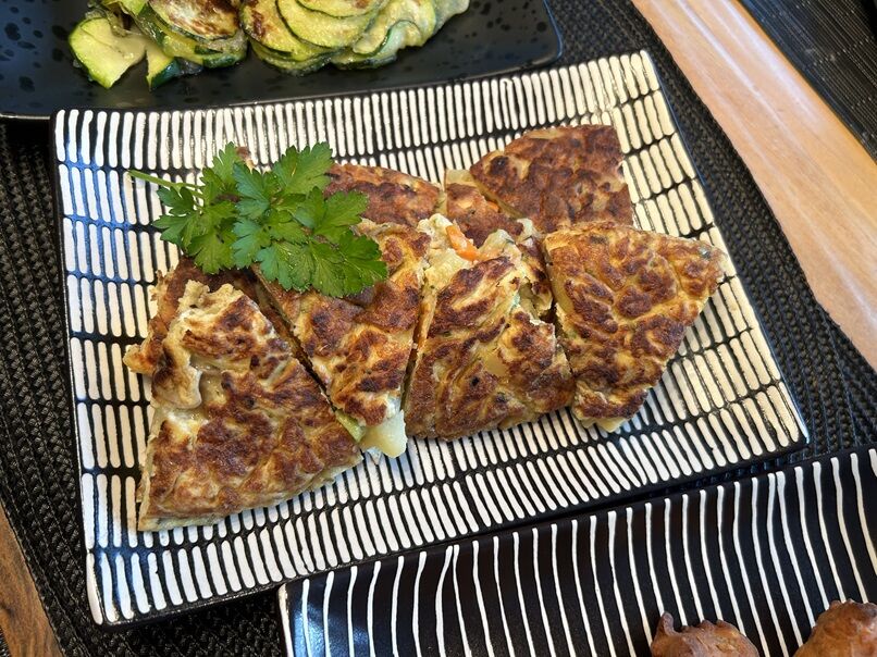 ズッキーニには塩をして、絞って水分を抜いてから、ヴェゲタと片栗粉を混ぜ焼くだけ。