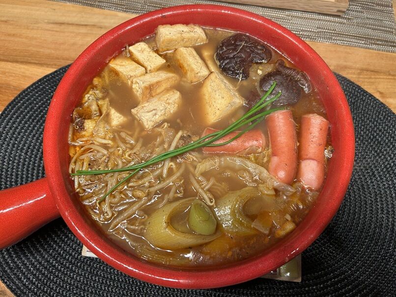 自作の厚揚げ、木綿豆腐、もやし、キャベツ、ポロねぎ、干し椎茸、