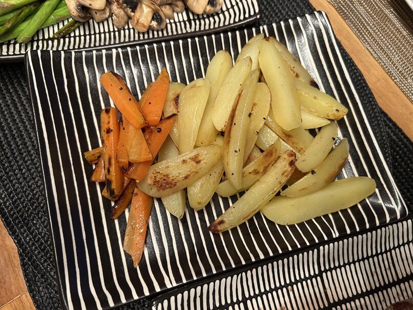 じゃがいも、人参、グリーンアスパラガス、マッシュルーム、ズッキーニのソテー。