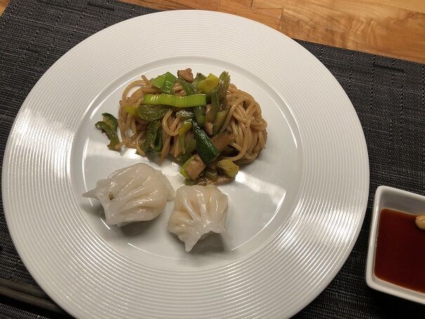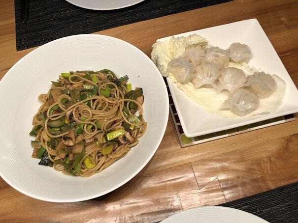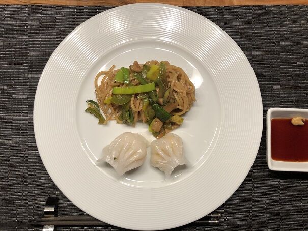 野菜たっぷり中華風焼きそば&エビ蒸し餃子。