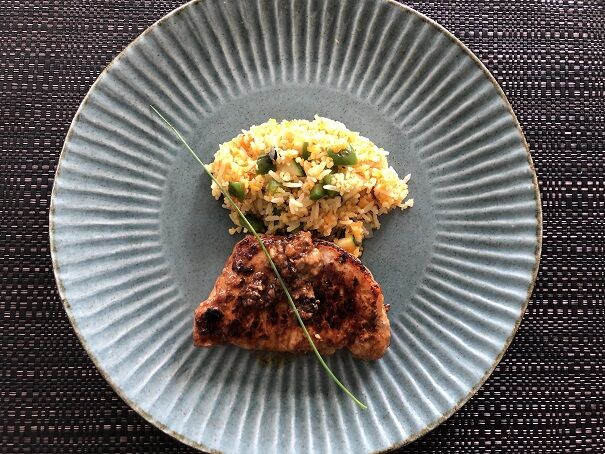 添えたのはすりおろした人参をたっぷり入れて炊いた長粒種ライスとブルグル。