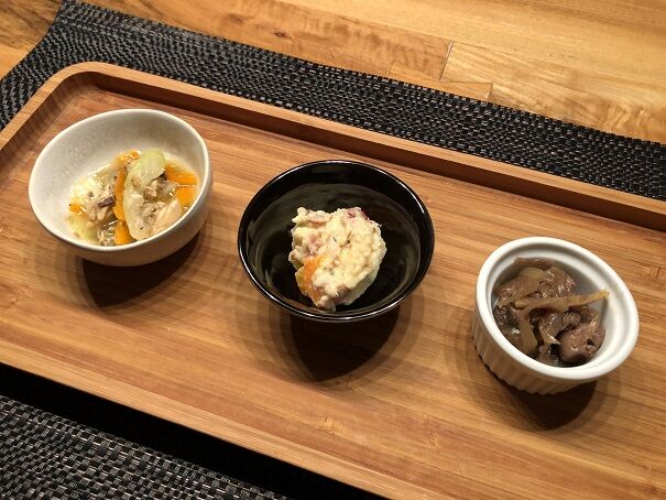サバのオイル漬けと野菜のエスカベッシュ、ポテトサラダ。