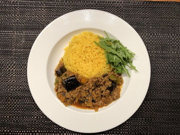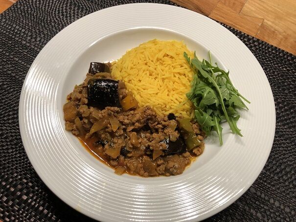 カレーには、牛ひき肉、茄子、緑とオレンジのパプリカ、玉ねぎを。