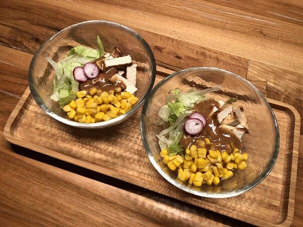 レタス、コーン、自作の厚揚げを乗せ、ごまドレッシングをかけました。