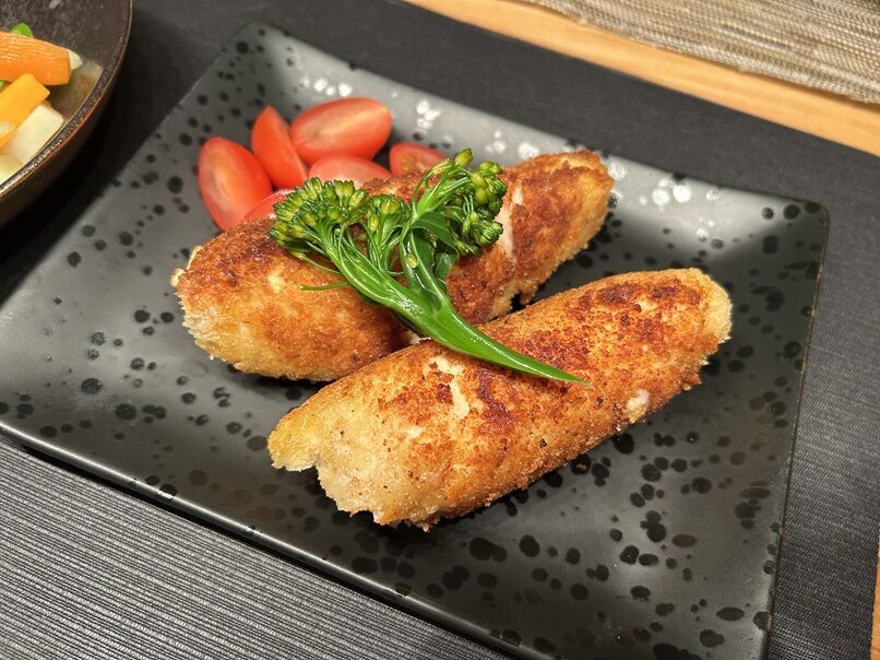 そこに塩、胡椒、ハム、チーズを乗せて、クルっと巻いてフライ仕様に。