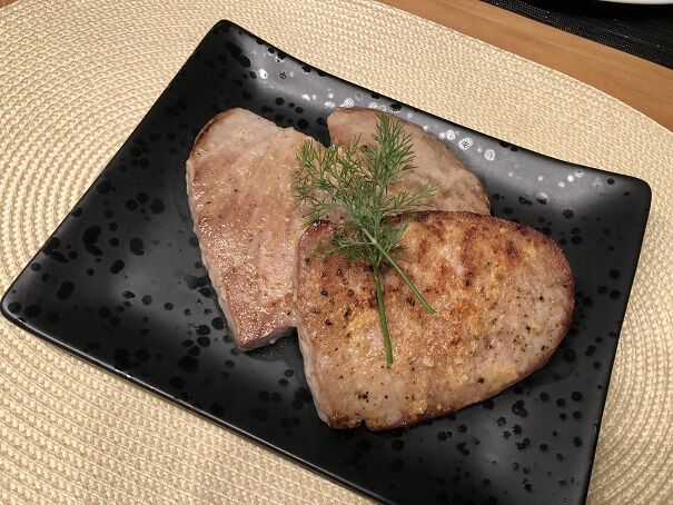 外側はカリッと中は半生で柔らかく、美味しいマグロでした。