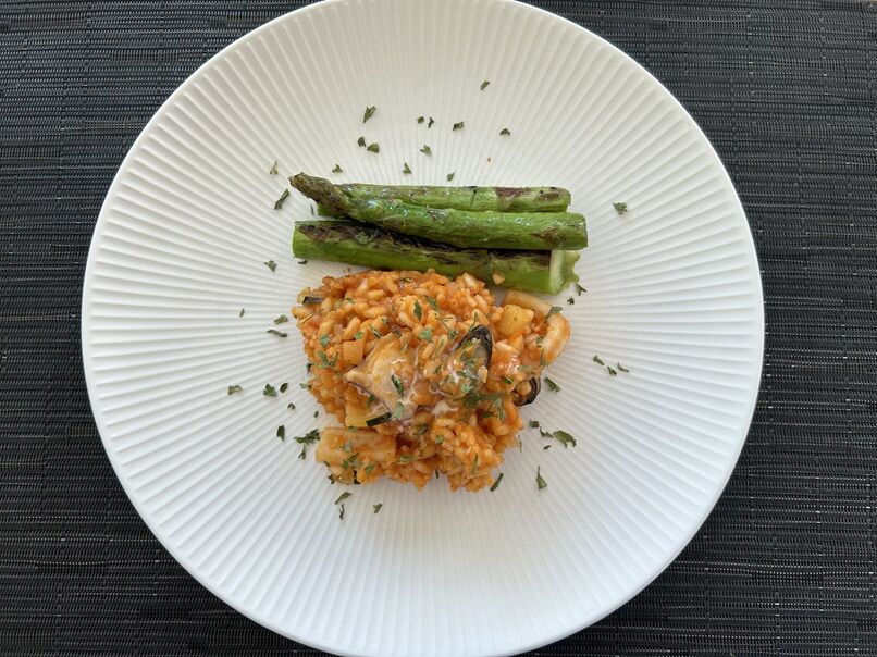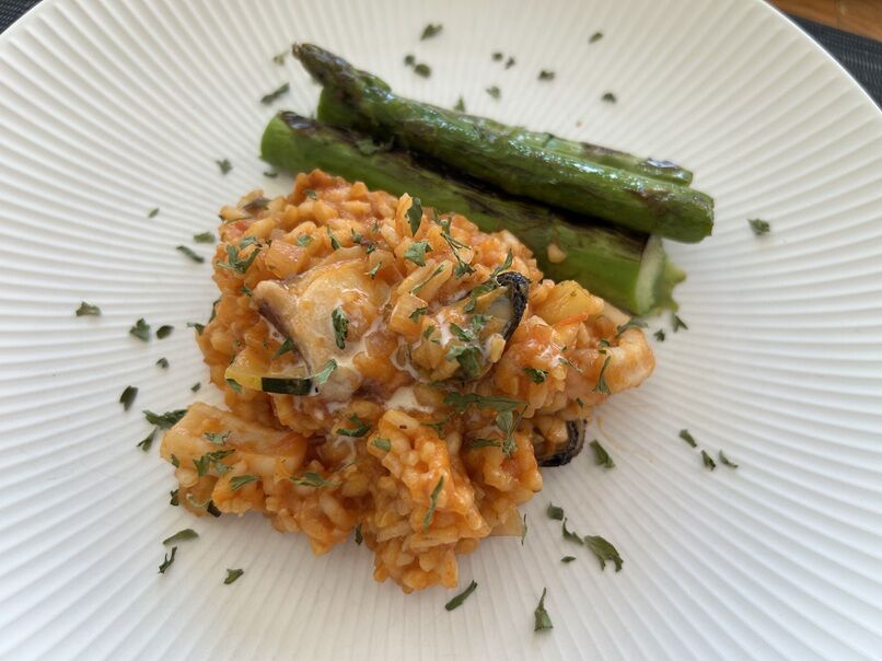 魚介のトマトリゾット、焼き野菜。