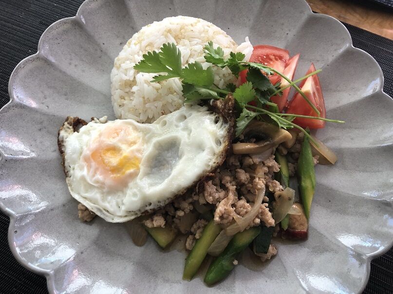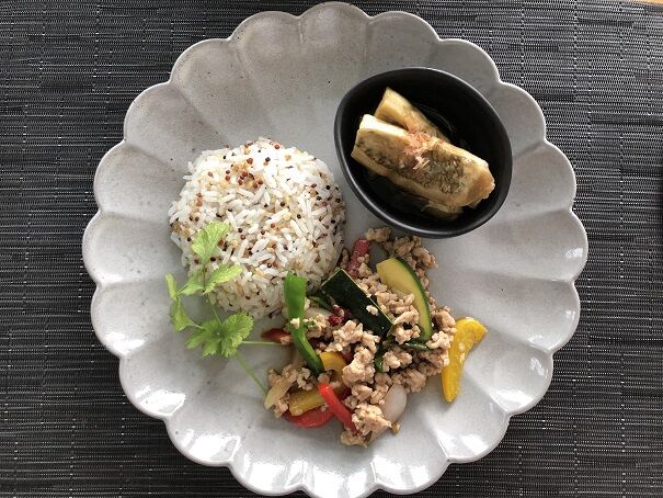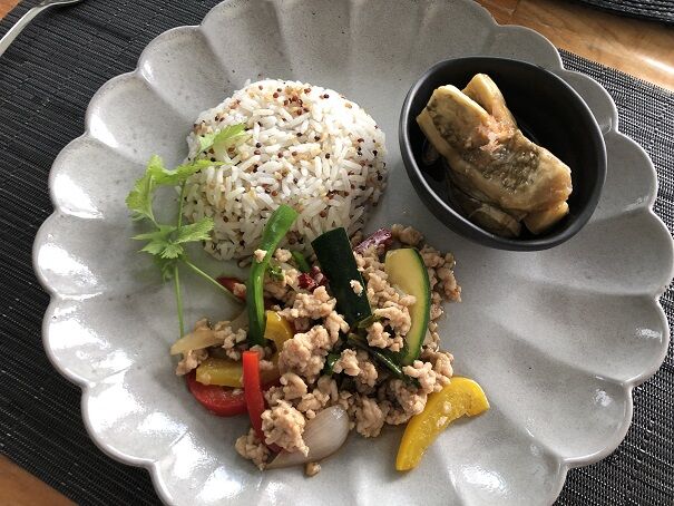 キヌアを入れたジャスミンライスと一緒に頂きます。