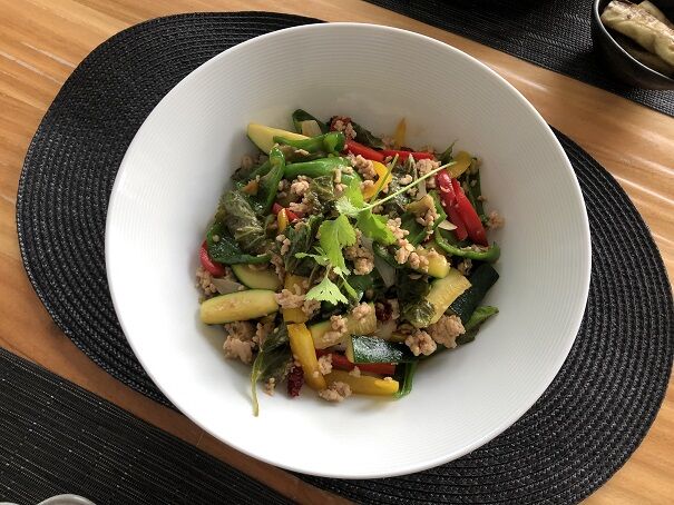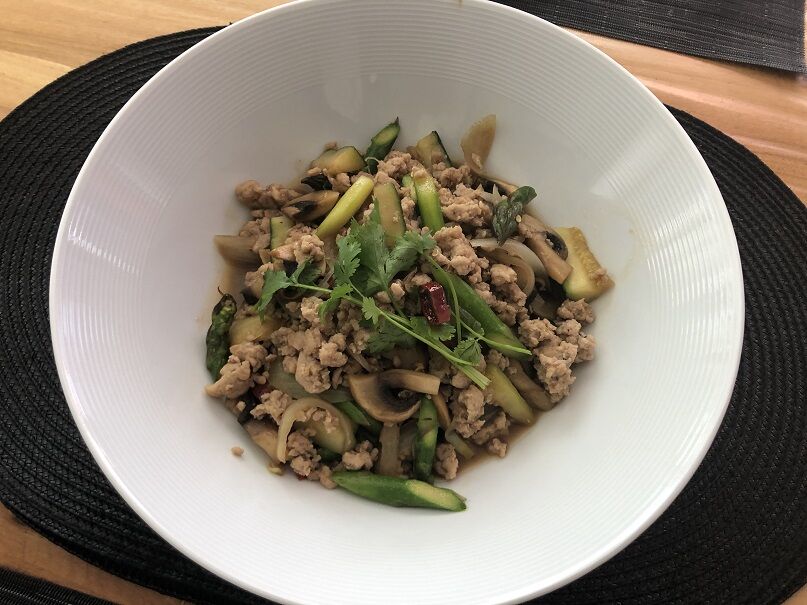 鶏ひき肉の他は、ズッキーニ、マッシュルーム、グリーンアスパラガス、玉ねぎを。