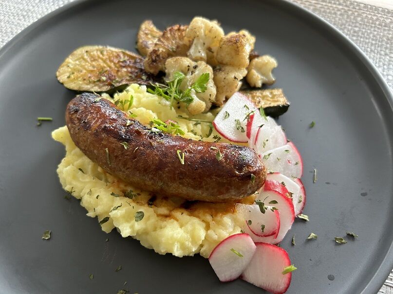 牛ひき肉の他にはポロねぎ、マッシュルーム、緑のパプリカ、ポロねぎをたっぷり。