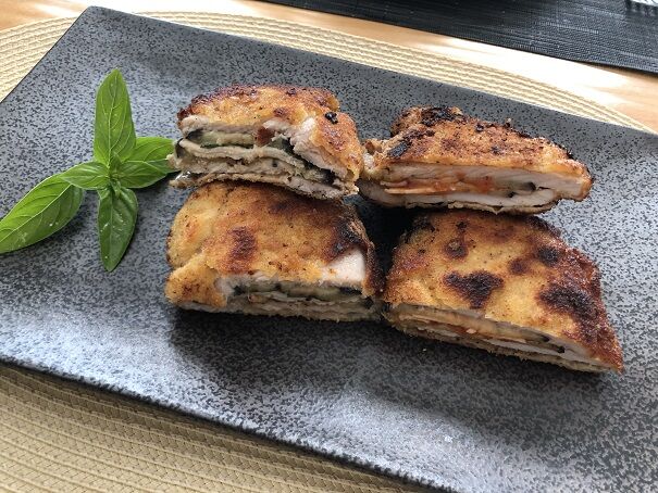 1つは、豚肉に茄子、トマトソース、パルメザンチーズ、市販の鶏ハムを挟んだもの、