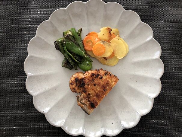付け合わせはパドロンの塩・胡椒炒め、じゃがいもと人参のグラタン風。