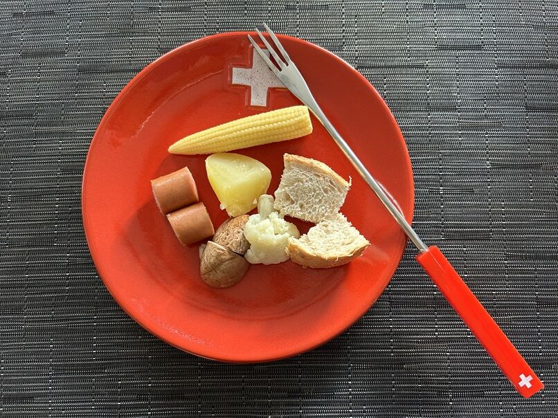 お皿にもチーズフォンデュ用の長いフォークにもスイス国旗!