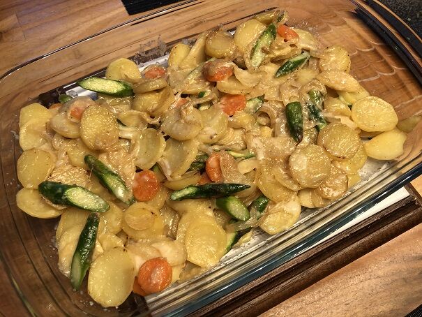 マッシュポテトのオーブン焼き、人参とズッキーニのソテーと一緒に。