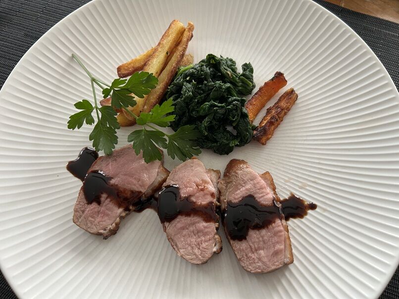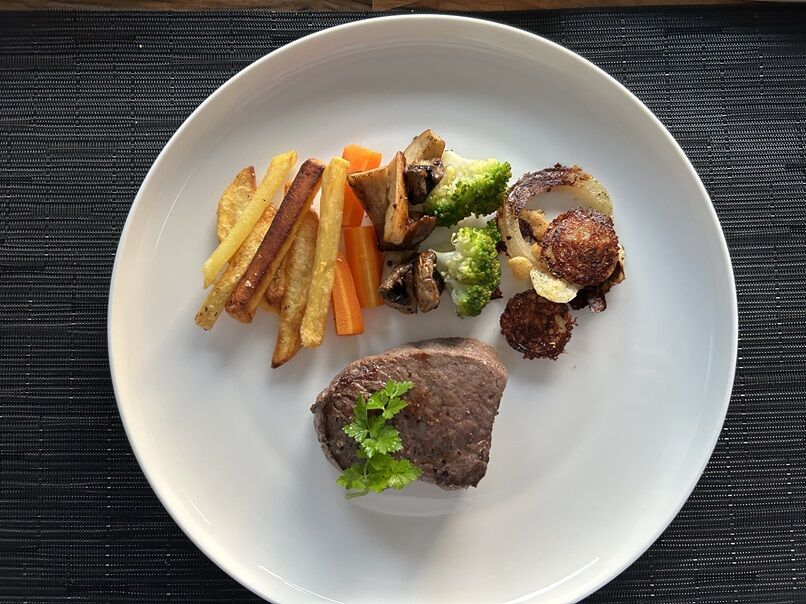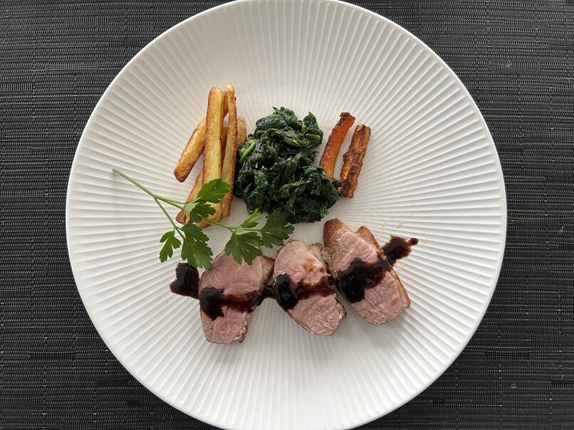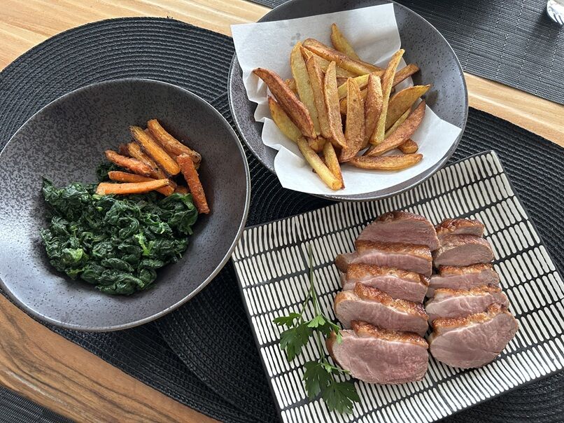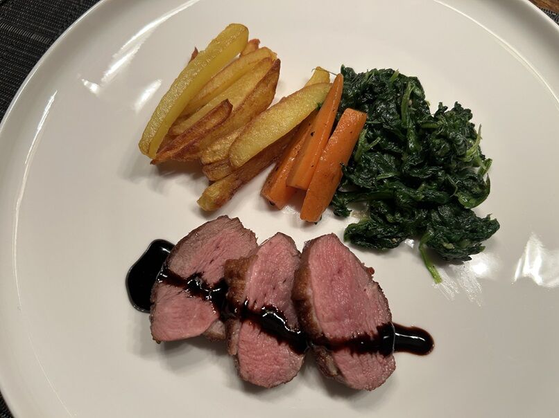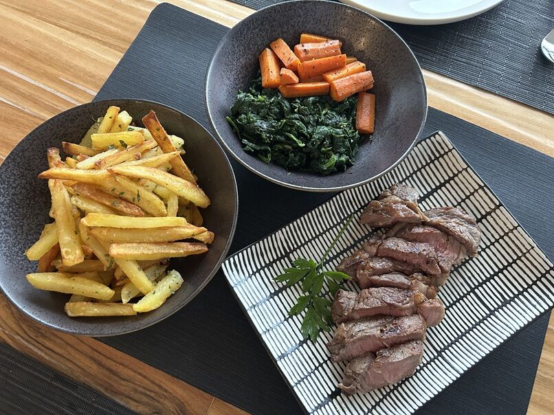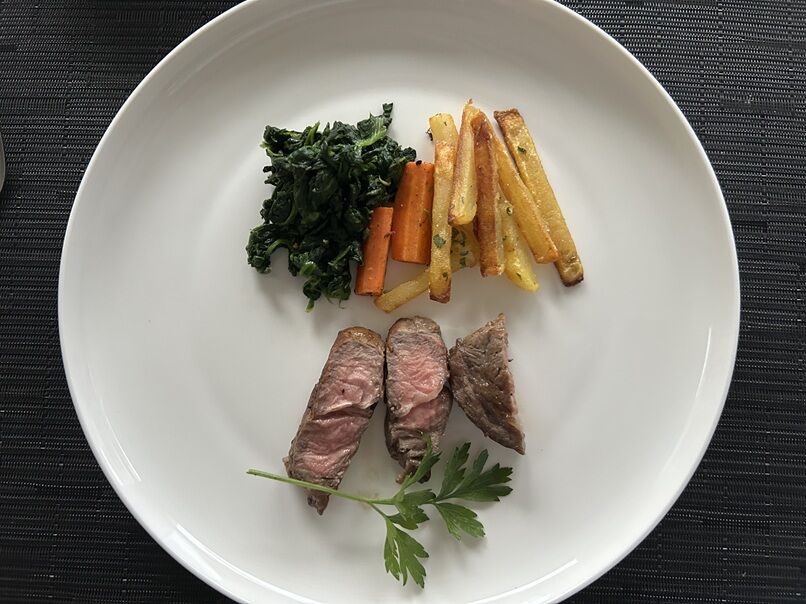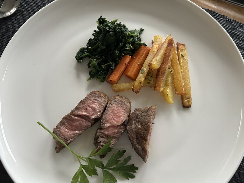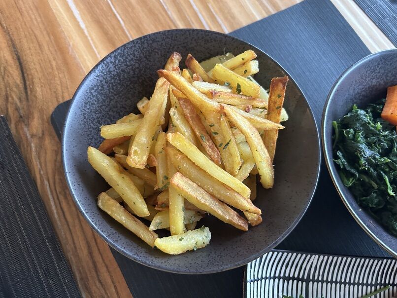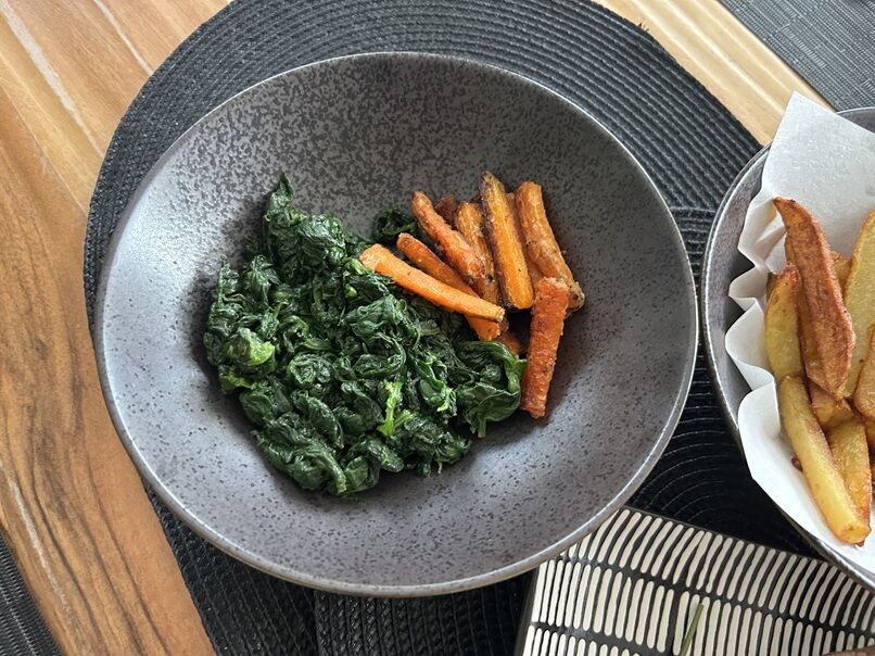 フレンチフライ、人参とほうれん草のソテーと一緒に。
