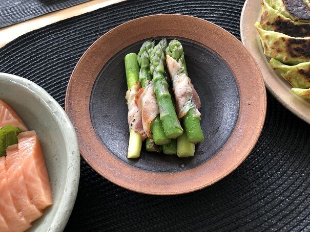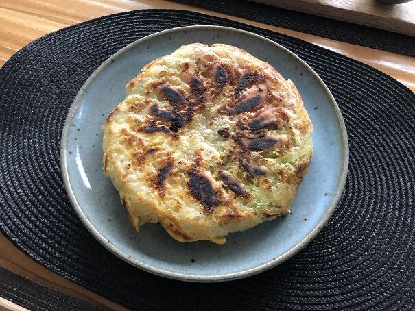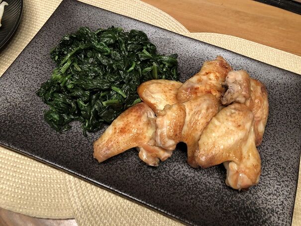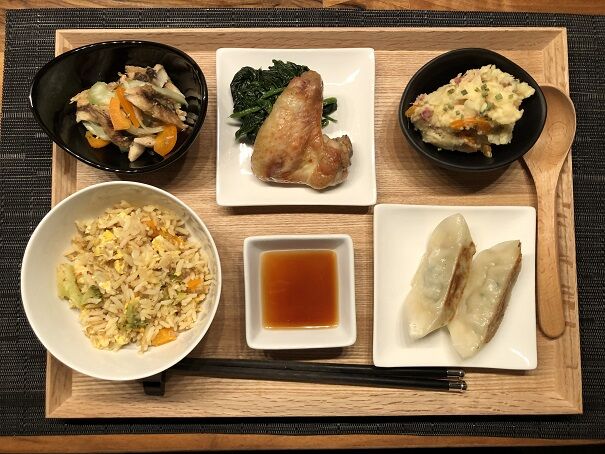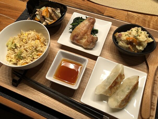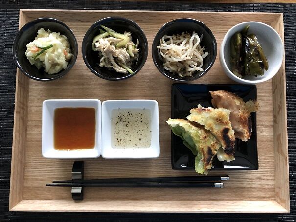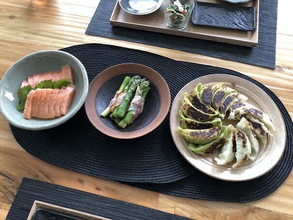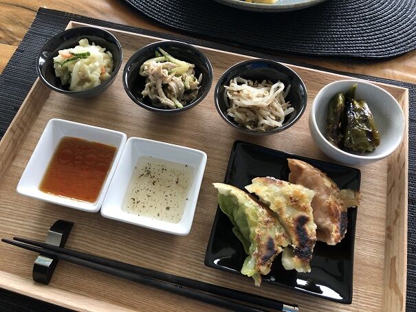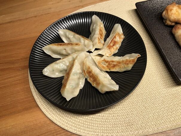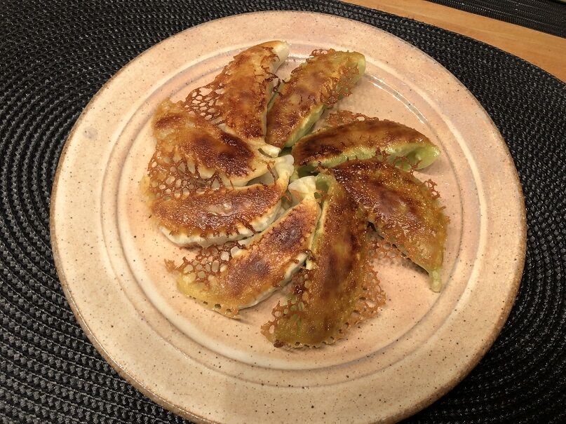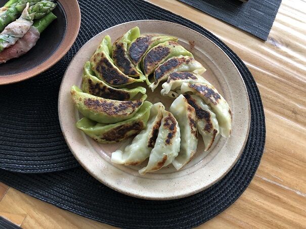 見えづらいですが、白い皮はチキン餃子、緑の皮は野菜餃子です。