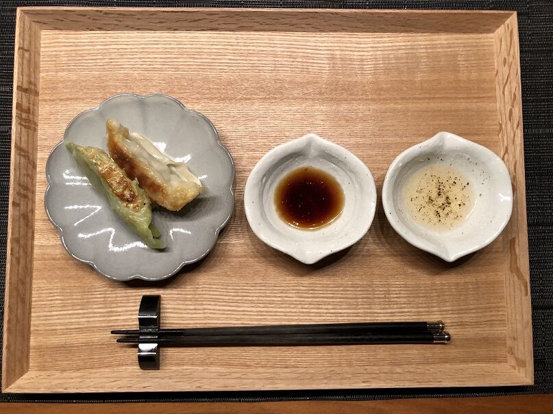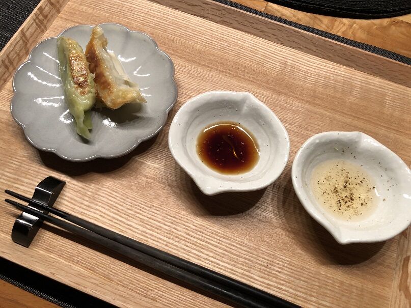 しょうゆ+酢+ラー油、酢+黒胡椒の2種類のタレで頂きます。