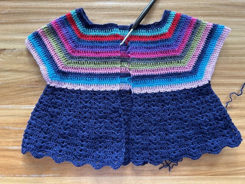 適当な長さまで編んだら両袖を編んで、縁取りをして、ボタンを付けたら出来上がり。
